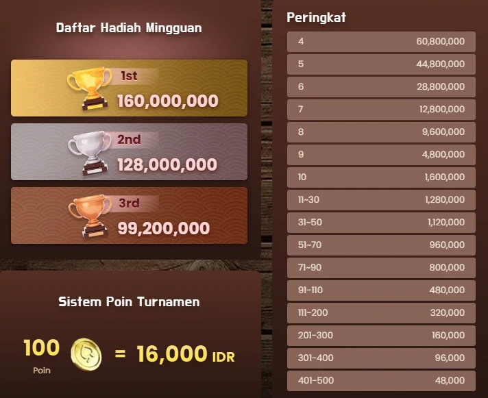 6. Jika ada dua atau lebih pemain dengan skor kemenangan yang sama, pemain yang pertama kali meraih skor tersebut akan berada di posisi yang lebih tinggi di papan peringkat.