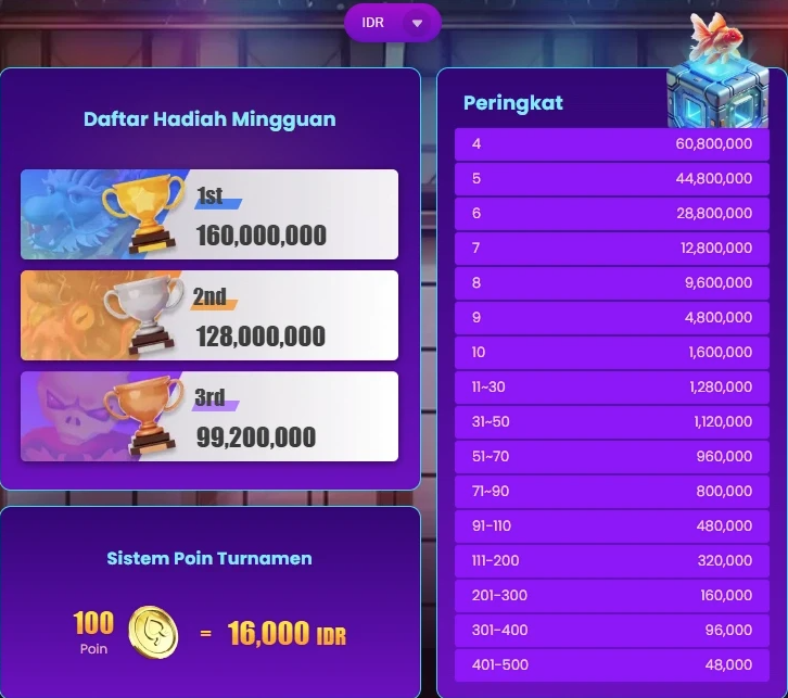 1. Total Hadiah Event ini adalah sebesar Rp 9.131.200.000,- yang akan dibagikan kepada seluruh pemenang Tournamen